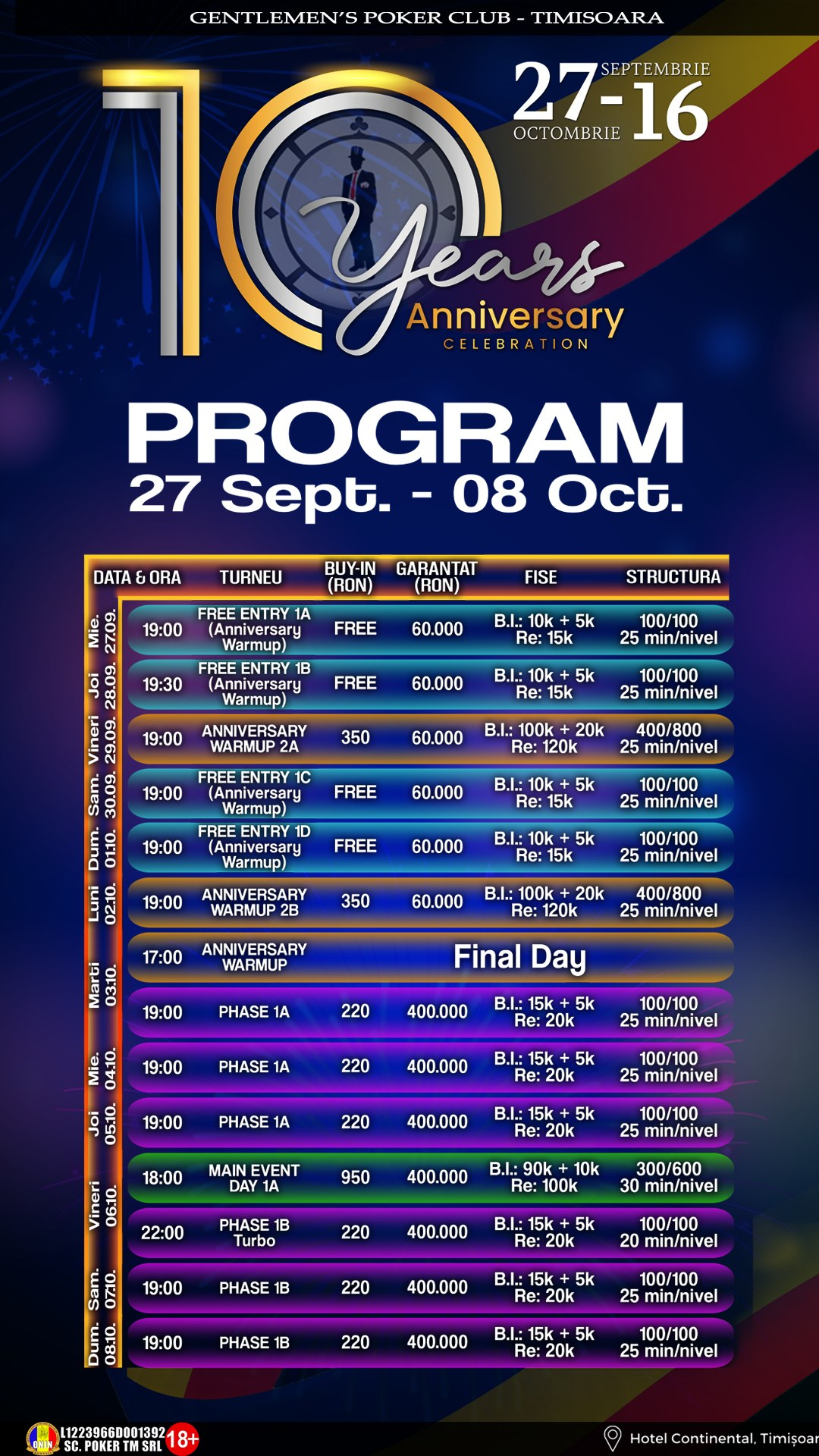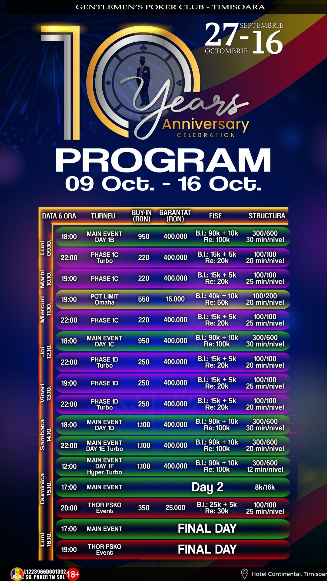 Cu entuziasmul crescând în fiecare zi, așteptăm cu nerăbdare turneul de poker 10 Years Anniversary care se apropie cu pași repezi! Programul este pregătit să aducă foc și pasiune în lumea pokerului, întinzându-se pe o perioadă de două săptămâni pline de adrenalina și strategii perfecte.